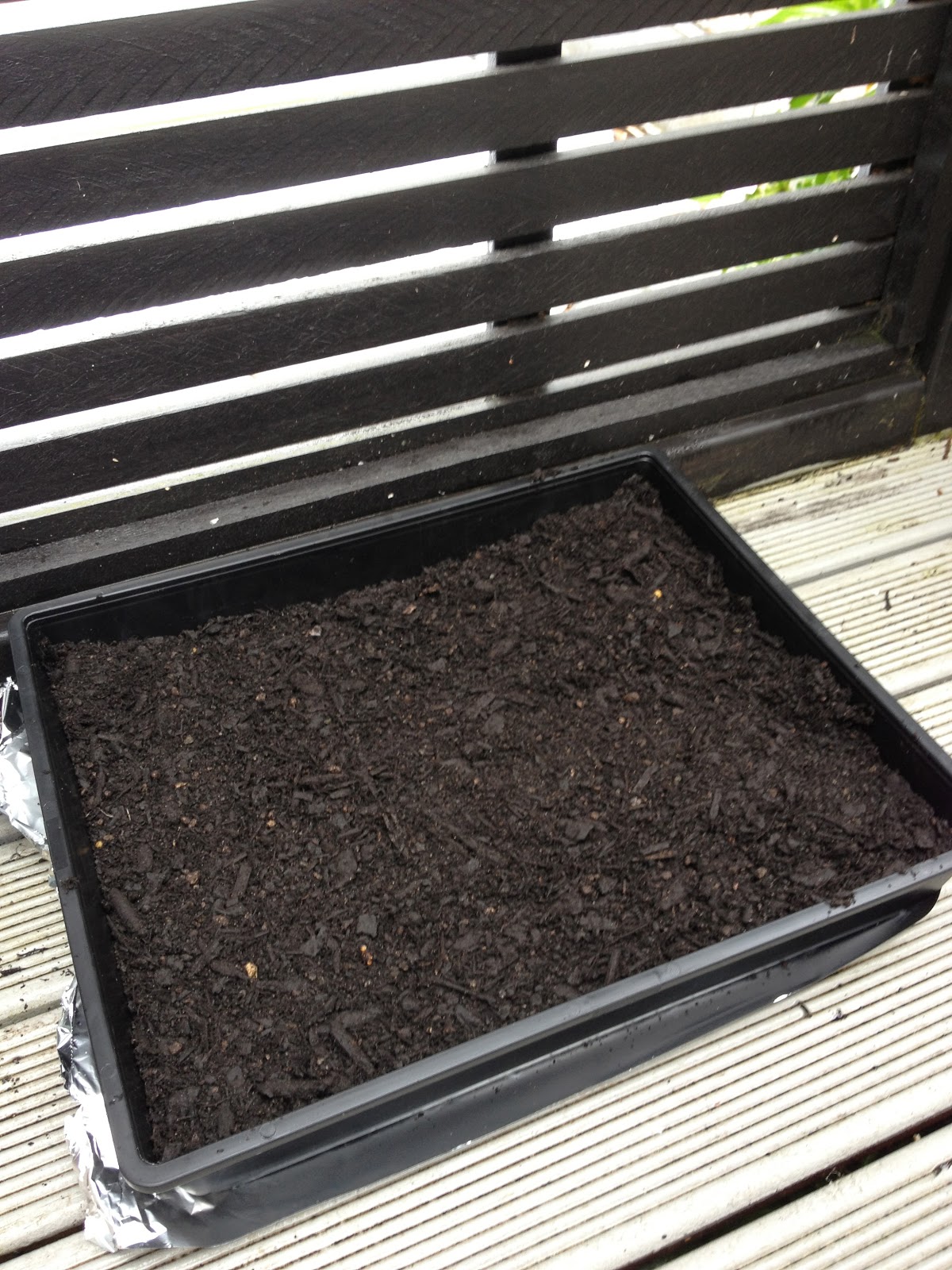 STEP TWO: Fill a shallow growing tray with soil and water until it is very moist.