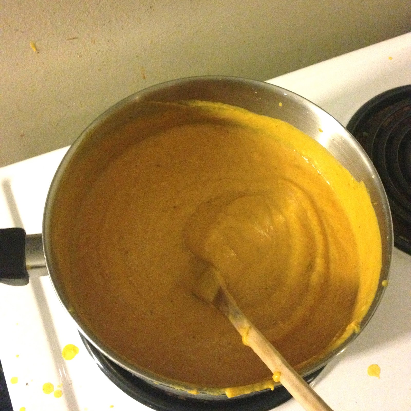 13. Take the soup of the heat, remove the cinnamon stick and then blend up. If using a stick blender, go and do it straight away! But if you have a food processor, wait for the soup to cool for about 20 minutes.