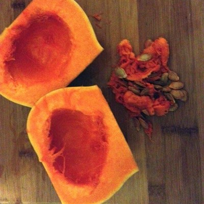 3. Scoop the seeds and pulp out of the bottom quarters of the squash. This is really easy to do with a spoon!