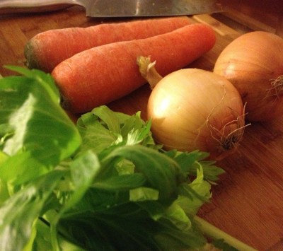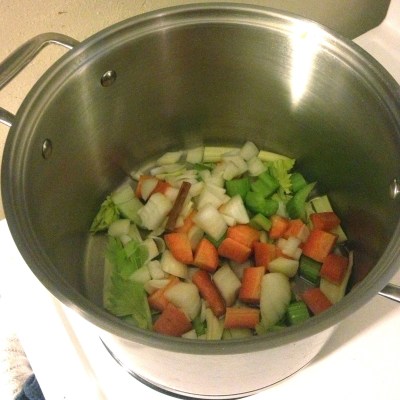 9. Put 2 Tbsp of vegetable oil into a large saucepan, and heat over medium heat. Put the diced onion, celery and carrot into the saucepan along with the celery stick.