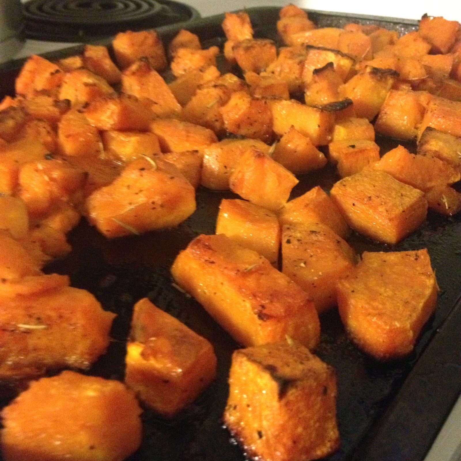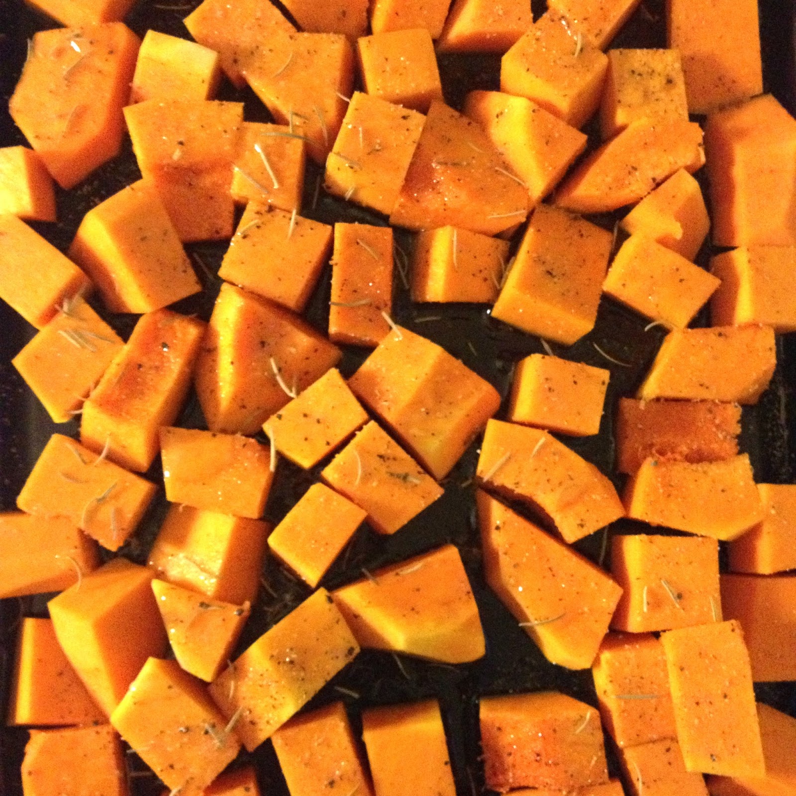 7. Get in there with your hands and mix it all up! This helps to ensure that every piece of squash is going to be full of flavor! Then put the squash in the oven for 30 to 45 minutes or until golden and caramelized. Turn the squash about half way through the cooking time.