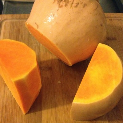 4. Once you have done this, carefully remove the skin from the squash. I found that using a knife and cutting the skin off, down towards the chopping board, was much easier than using a vegetable peeler. But you do whatever works well for you!