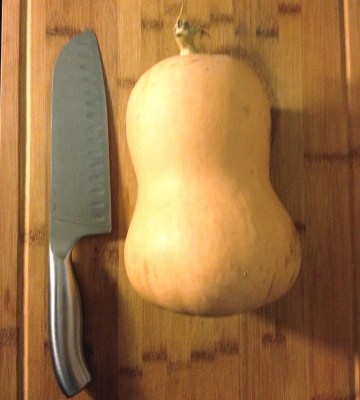 1. To begin, get your squash and a big, sharp knife that you can use to cut through the hard skin of the squash. Also, preheat your oven to 400F or 190C.
