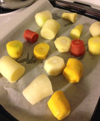 To begin, wash your carrots and parsnips really well. They tend to be more gnarly than shop bought carrots, so lots of dirt gets trapped. Then peel them and wash them well again to remove the last of the dirt. After they are peeled, cut off any long bits that are super thin, as these will cook a lot faster than the rest. You won’t want to use these bits but save them for something else like stock or soup!