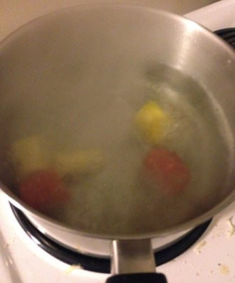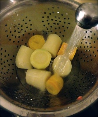 Bring a medium sized pot of water to the boil. And salt well. While you are waiting for the water to boil cut the carrots and parsnips into even sized pieces so that the cooking time is the same for the different pieces. One the water has boiled, put a few at a time (I did like 5 or 6 at a time) in the pot. Allow them to cook for 4 or 5 minutes.