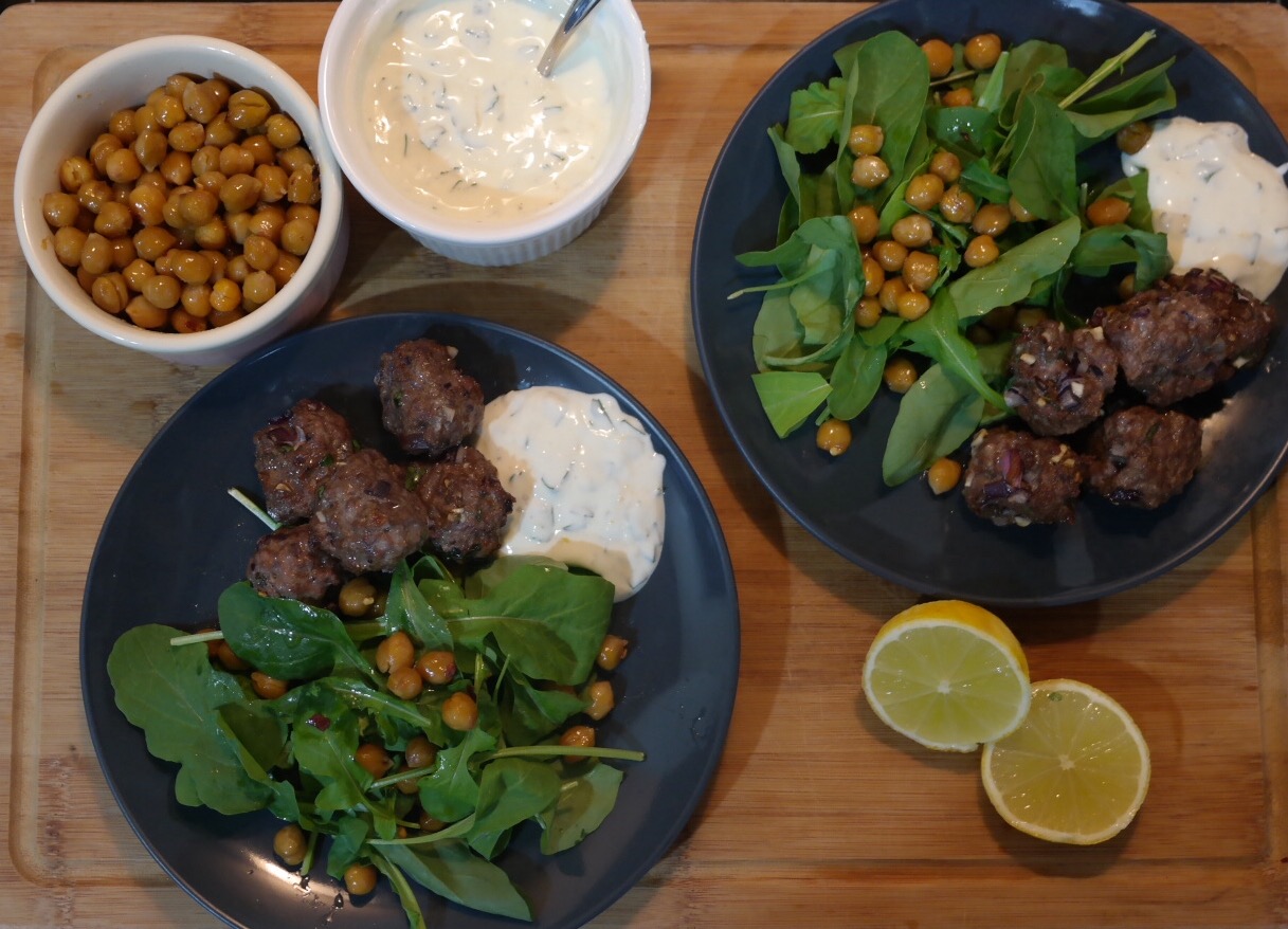 Mediterranean Lamb Meatballs with Yoghurt Sauce and Chickpea and Rocket Salad
