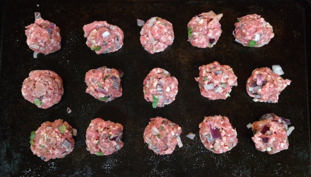 4. When all combined, roll into small balls (just smaller than a tablespoon) and place on a lightly greased baking tray. Then put this in the oven (same oven as the chickpeas is fine). The meatballs will take anywhere from 10-15 minutes to cook, depending on the size.