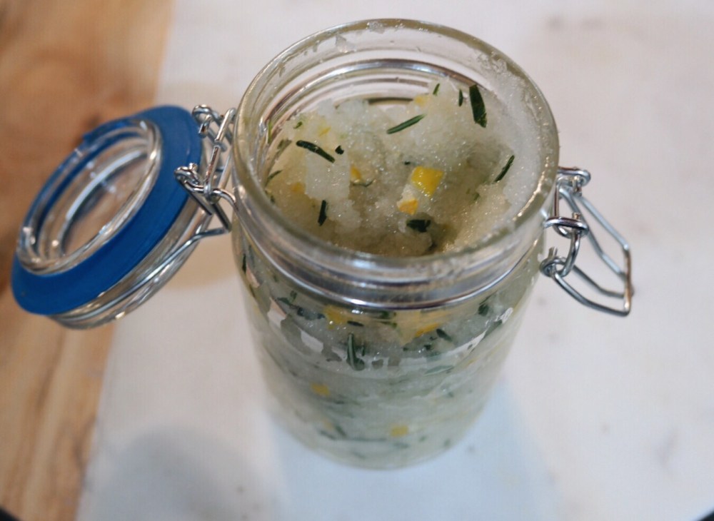 You’ve all been there. You’ve had a great day out in the garden, and then you take off your gloves (if you wear them…) and somehow the dirt and smell from the soil and compost has made its way to your hands. The worst is the compost smell! And that really likes to linger. So my new favorite thing to use after after a day in the garden is my homemade Rosemary and Lemon Sugar Scrub (made with homegrown lemons and rosemary!).